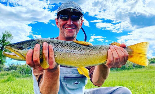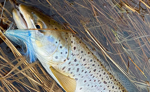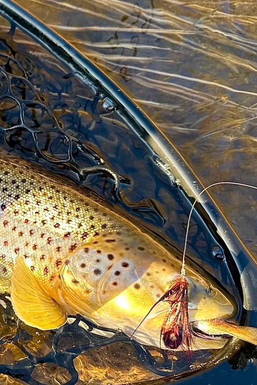 A beautiful brown succumbs to one of Jonny's patterns. Yes, that is a baitfish sticking out of its mouth!